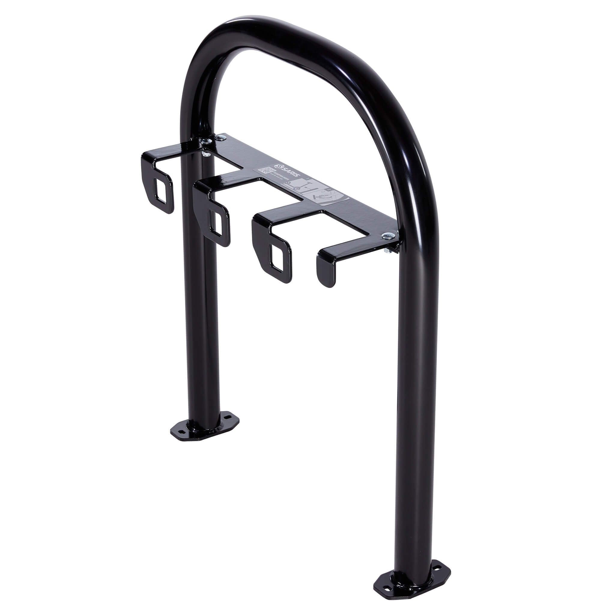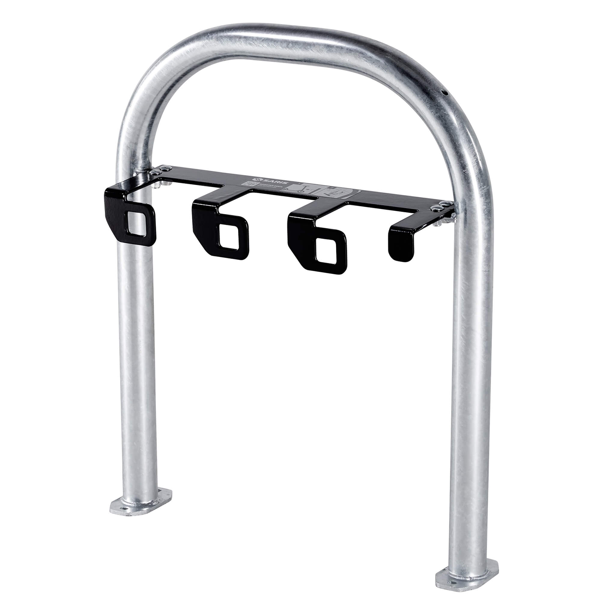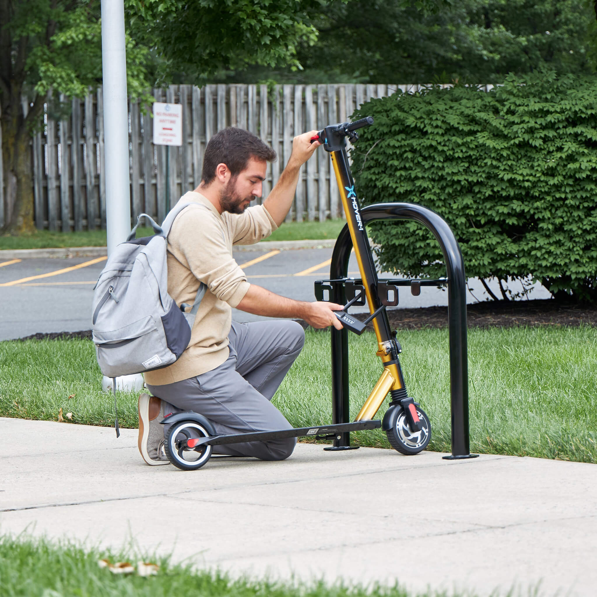 Inspired by the Bike Dock design, this scooter parking rack incorporates individual bays to park up to three electric scooters, while allowing space for a bike to park on the opposite side. Integrated locking points allow securing the scooter with a standard bike lock, while a protective vinyl coating prevents damage to your scooter’s handlebars, providing a solution for urban scooter parking needs.