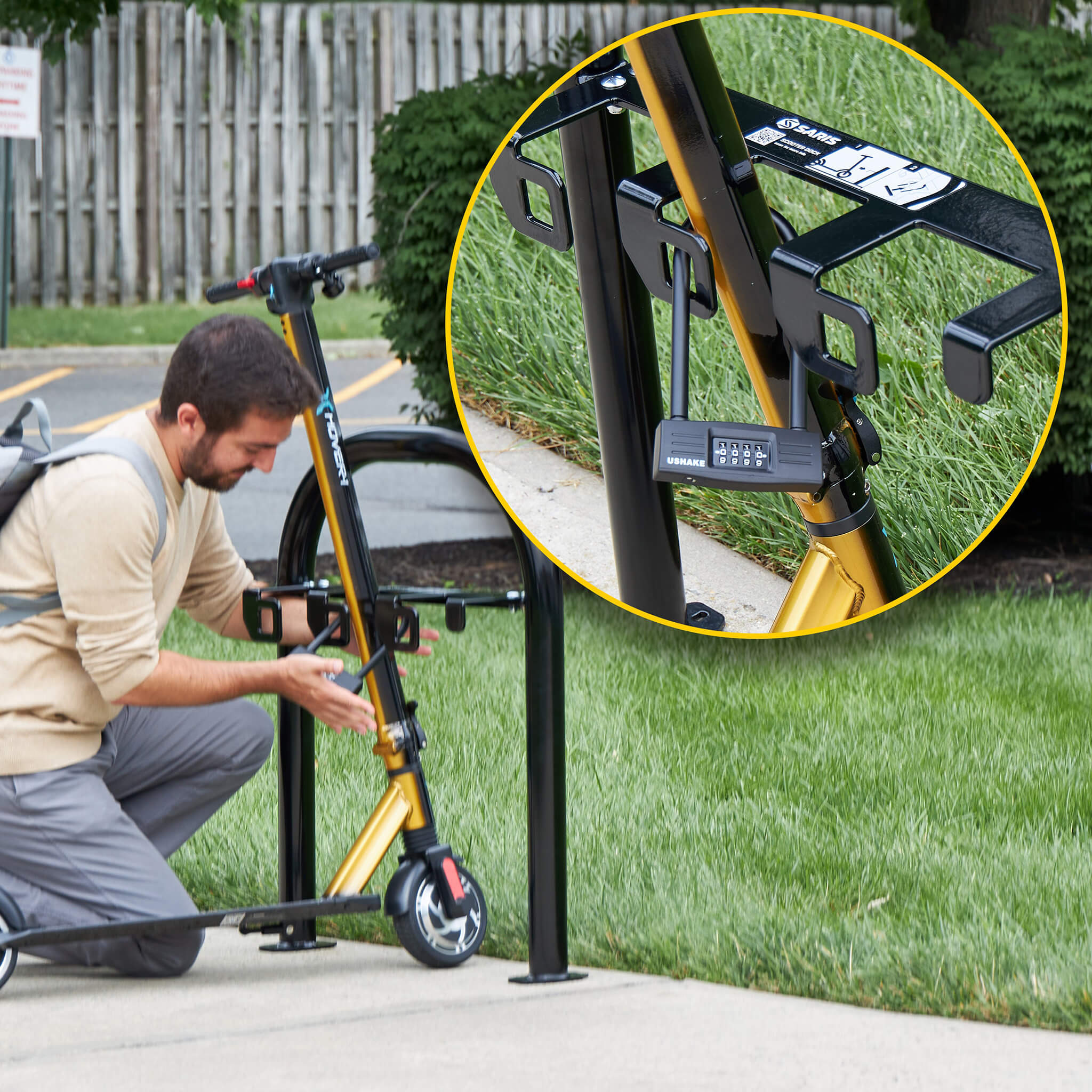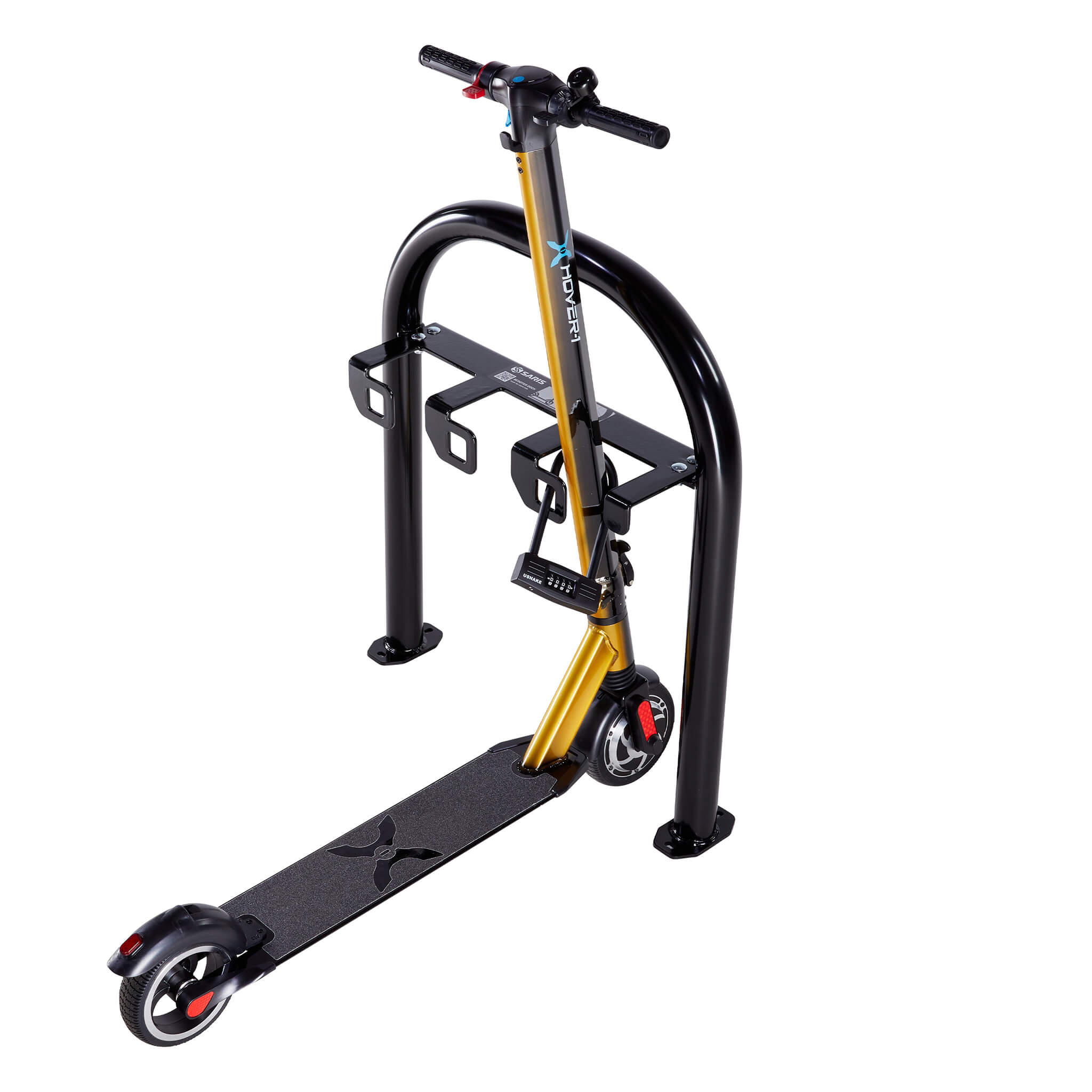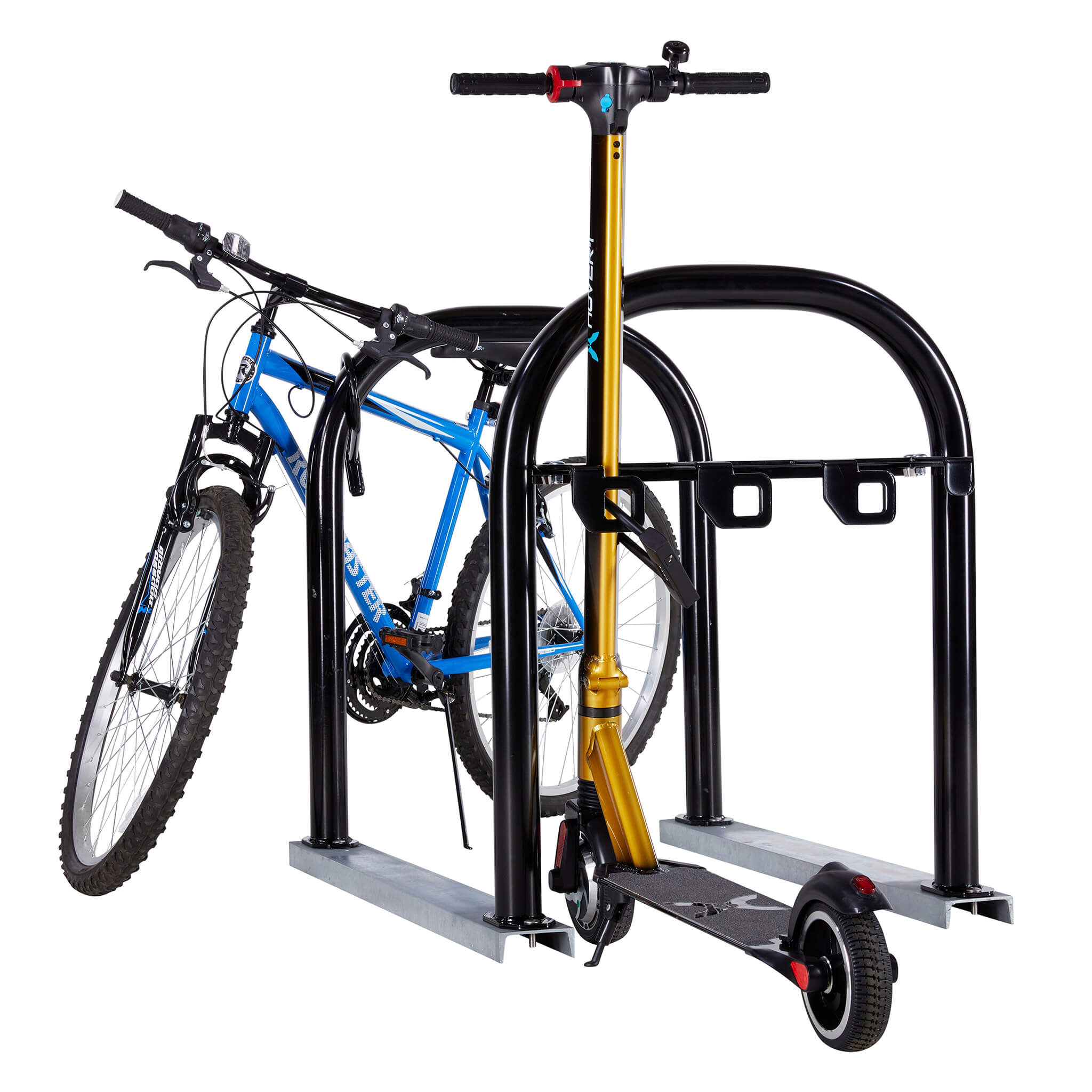 - Parks up to 3 scooters while accommodating a bicycle on the opposite side