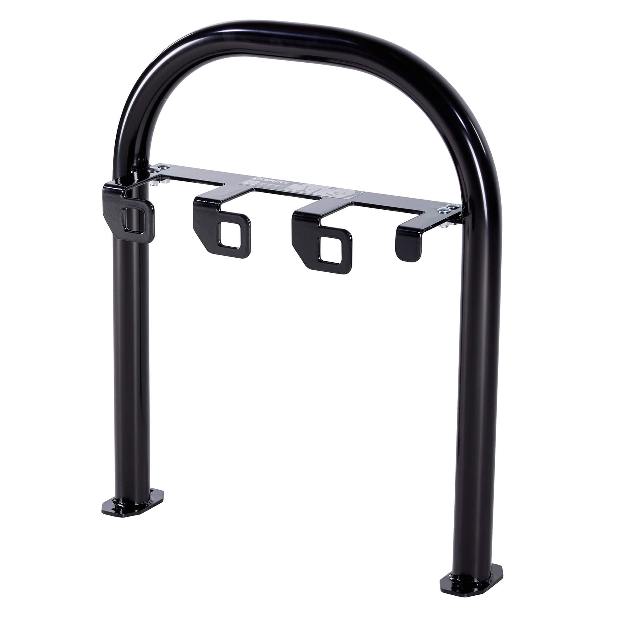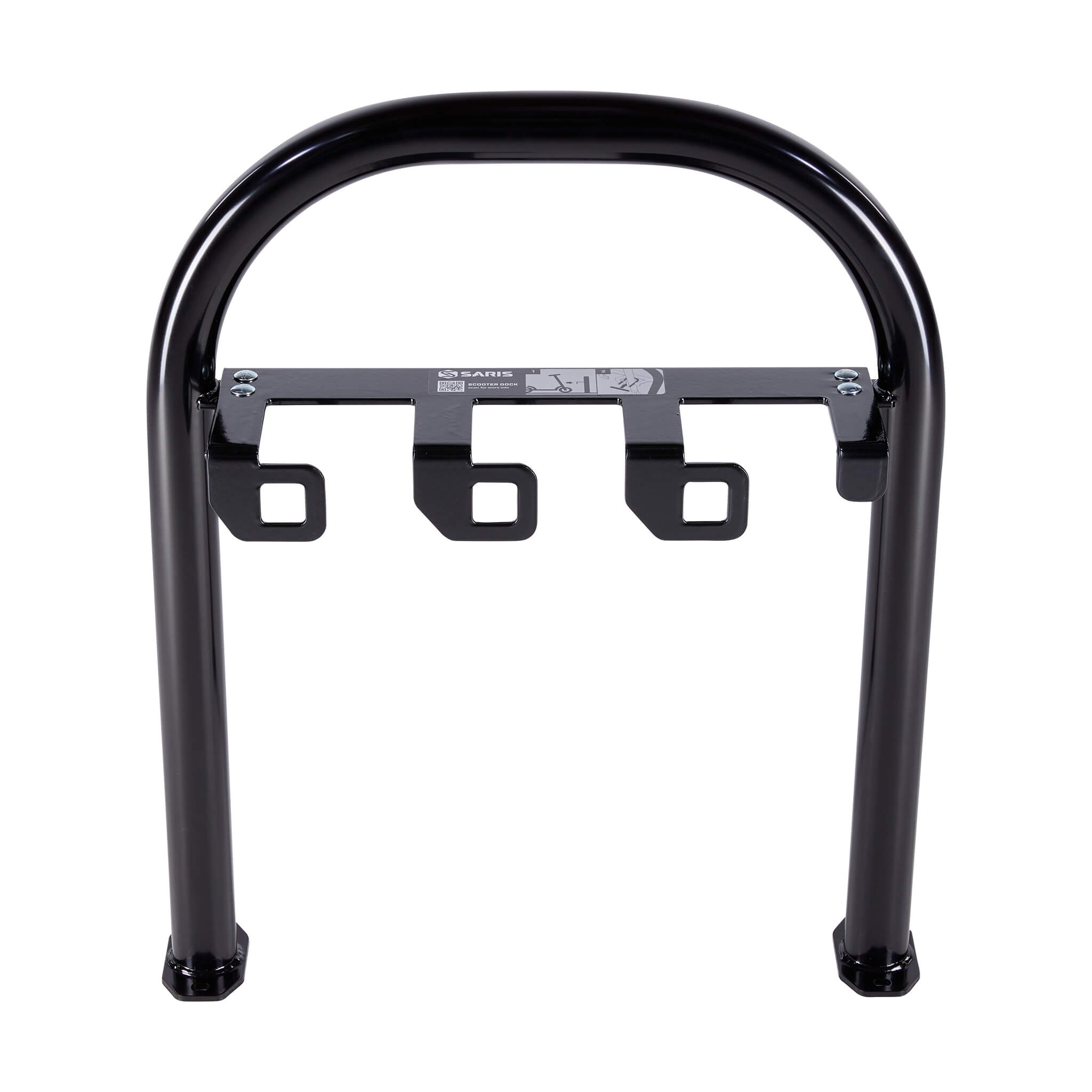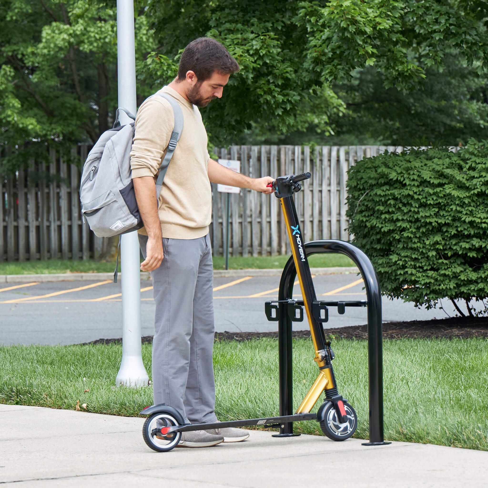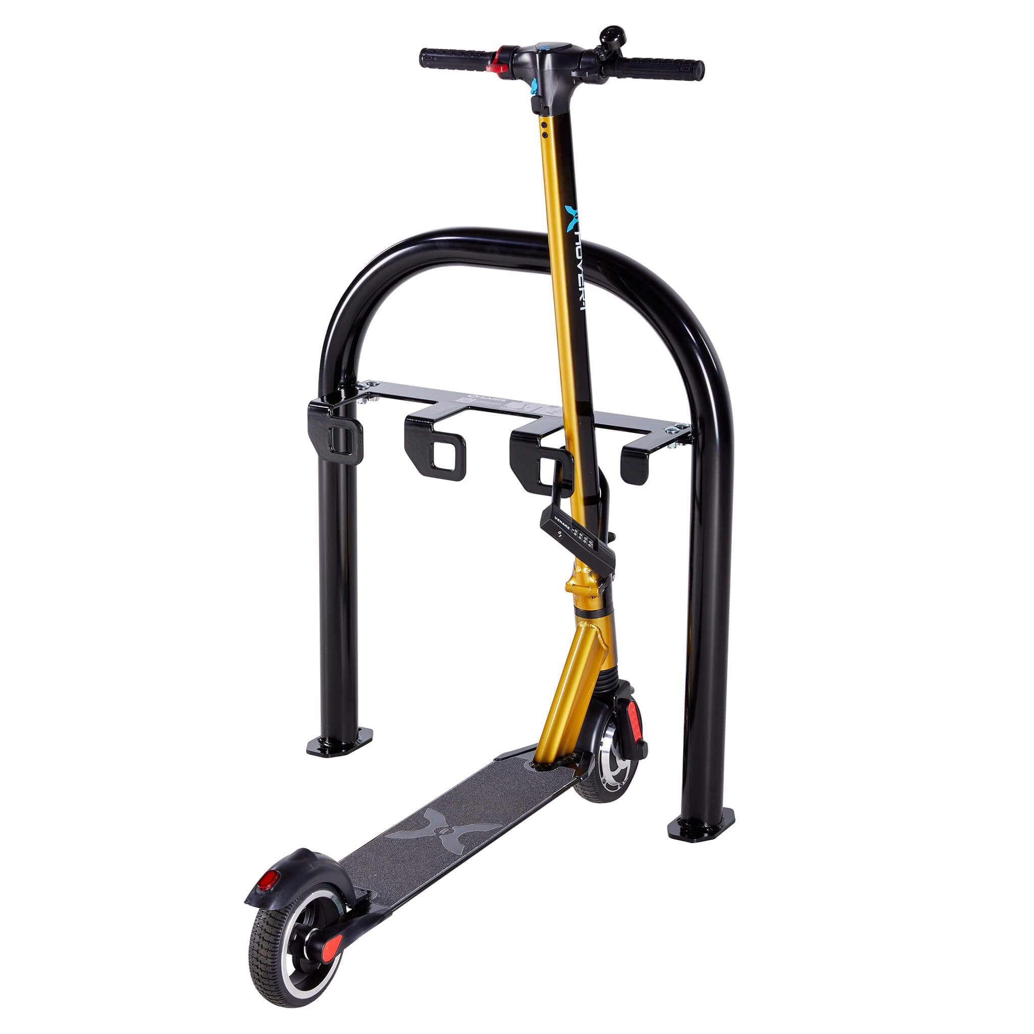 - Parks up to 3 scooters while accommodating a bicycle on the opposite side